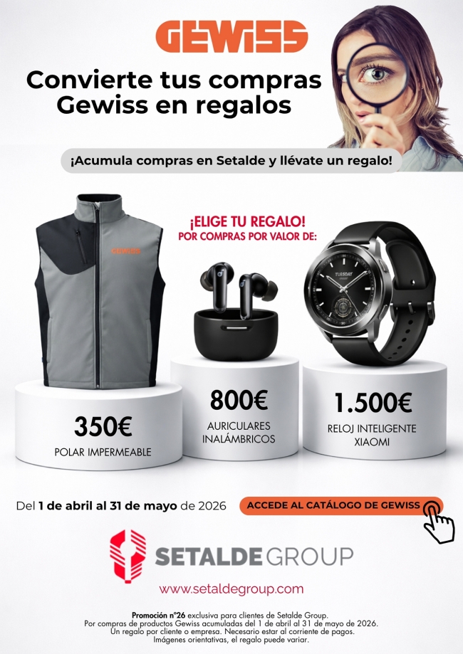 Del 1 de abril al 31 de mayo de 2026, todas las compras de producto Gewiss realizadas en Setalde Group serán acumulables dentro de esta promoción, permitiéndote acceder a diferentes niveles de regalo.